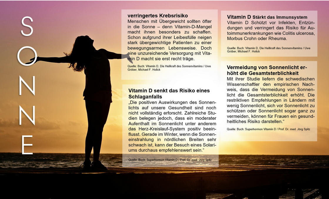 Ohne Licht verkümmert die Haut – sie wird dünn und blass. Verschiedene Lichtspektren haben unterschiedliche Wirkungen auf die Haut und den Organismus. Sonnenlicht verbessert die Blutfließeigenschaften und regt die natürliche Vitamin D-Bildung des Körpers an. Das Vitamin D stärkt die Knochen und schützt vor Osteoporose.Zusätzlich sorgt die UV-Stahlung für eine attraktive Bräunung der Haut. Bei Überdosierung kann es aber auch zum Sonnenbrand führen. Durch die sinnvolle Kombination der Lichtspektren können die biopositiven Wirkungen erhöht und ungewollte Begleiterscheinungen minimiert werden.